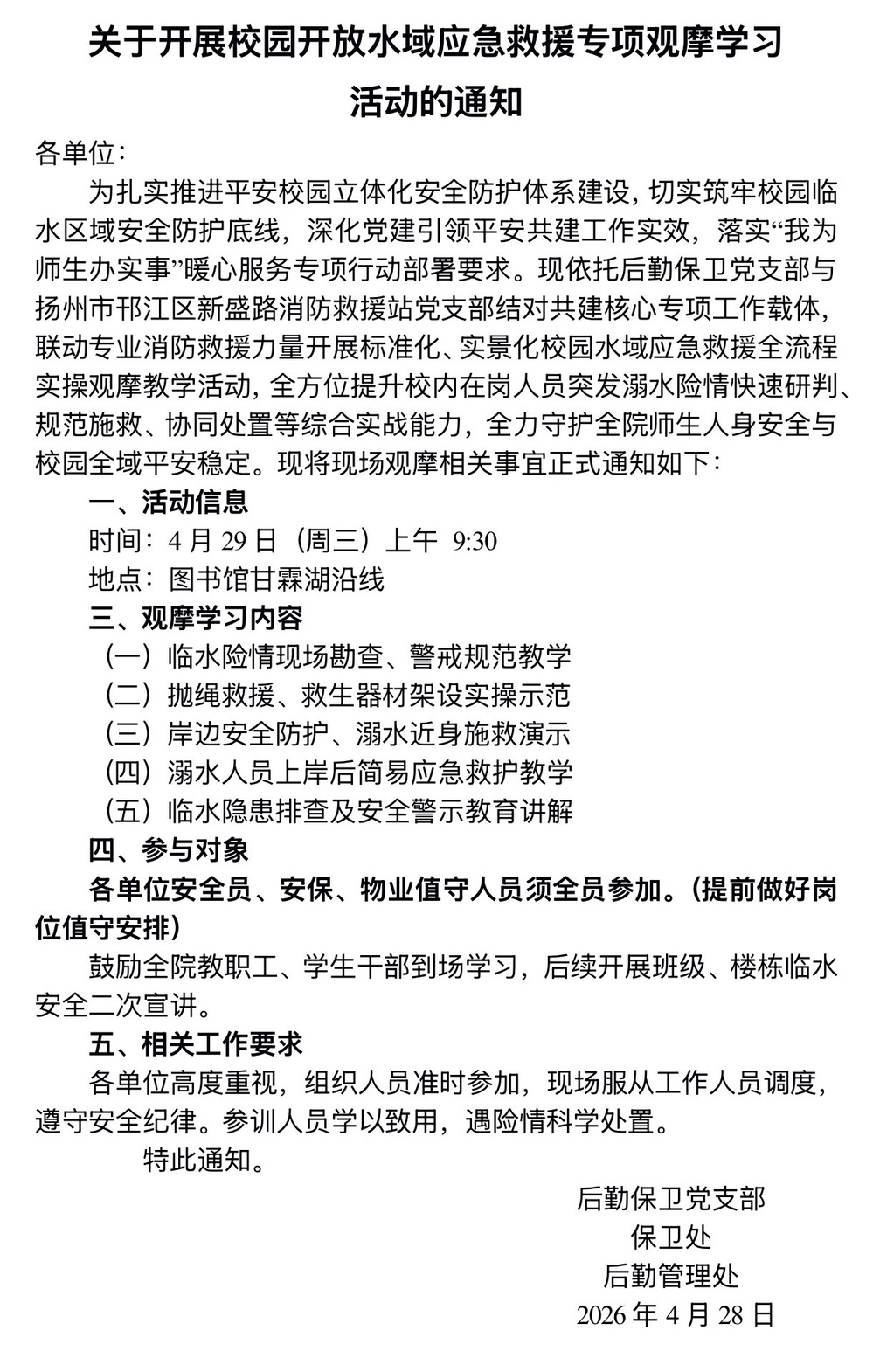 关于开展校园开放水域应急救援专项观摩学习活动的通知